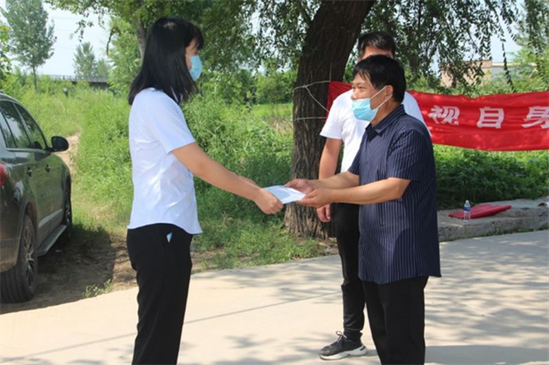 白庄村党支部书记白得全代表村两委接过捐赠款项并表示诚挚的谢意,他说:“你们的爱心让大家感受到了社会的温暖;你们的行动让大家体会到了团结的力量;你们的奉献给了大家战胜疫情的希望!”