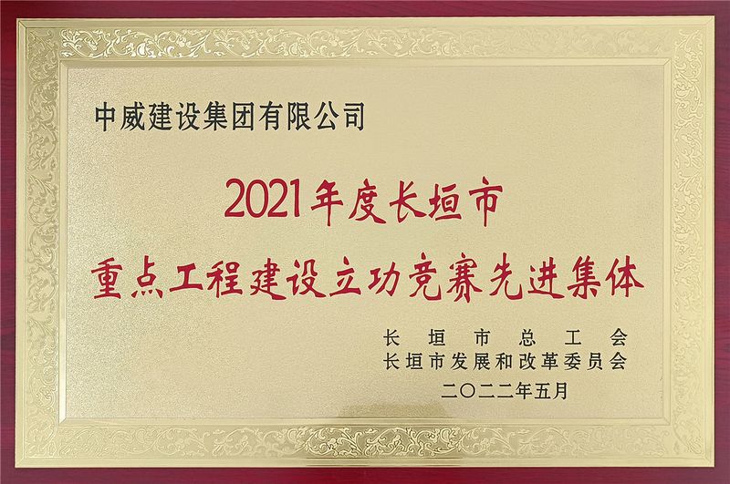 在长垣市总工会、长垣市发展和改革委员会组织的2021年全市重点工程建设项目开展的“比工程质量、比安全生产、比建设进度、比技术创新、比科学管理、比文明施工、创和谐团队”为主要内容的“六比一创”立功竞赛活动中,中威集团荣获2021年度长垣市“重点工程建设立功竞赛先进集体”荣誉称号。