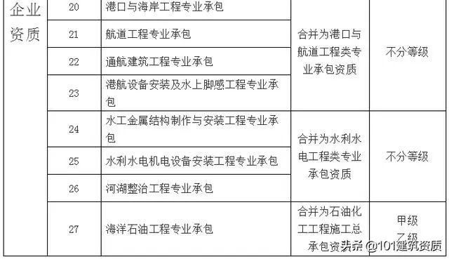 2、施工资质。将施工总承包企业特级资质改为施工综合资质,可承担各行业、各等级施工业务;保留12类施工总承包资质;将36类专业承包资质整合为14类;将劳务企业资质改为专业作业资质,由审批制改为备案制。综合资质只设甲级,施工总承包资质等级压减为甲、乙两级,专业承包资质和专业作业资质不分等级。改革后,施工企业资质类别和等级由138个压减为40个,压减71%。