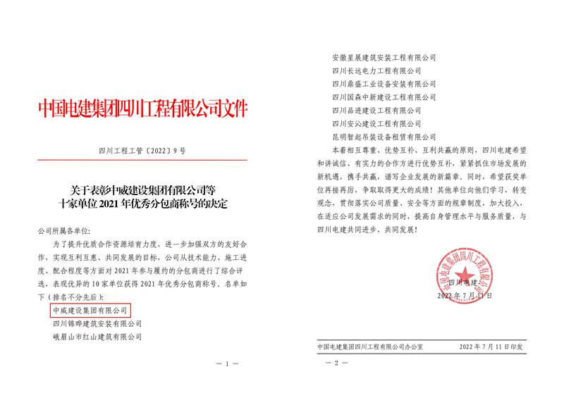行业要闻 | 中威集团被中国电建集团四川工程有限公司授予“2021年度优秀分包商”荣誉称号