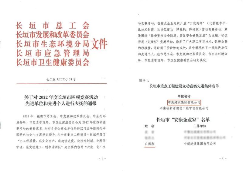 近日,由长垣市总工会、长垣市发改委、长垣市卫健委、长垣市应急管理局、长垣市生态环境分局联合举办的2022年度全市重点工程建设项目“六比一创”立功竞赛活动结果出炉,中威集团凭借优异的成绩再次荣获了“重点工程建设立功竞赛先进集体”荣誉称号,集团董事长白德欣被授予“安康杯企业家”荣誉称号。